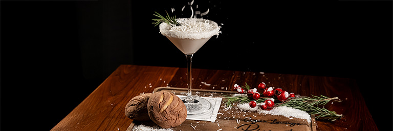Malibu Rum, Coconut Cream, Coconut Flake Rim, Garnished with Coconut Flakes and Rosemary