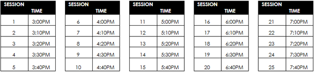 - Registration will begin at 2:00PM and until all session slots are full or at the start of the last session.