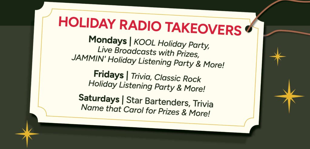 Visit throughout the month for all the holiday excitement – including concerts, bingo raffle games, prizes, DJs, and star bartenders creating holiday cocktails.