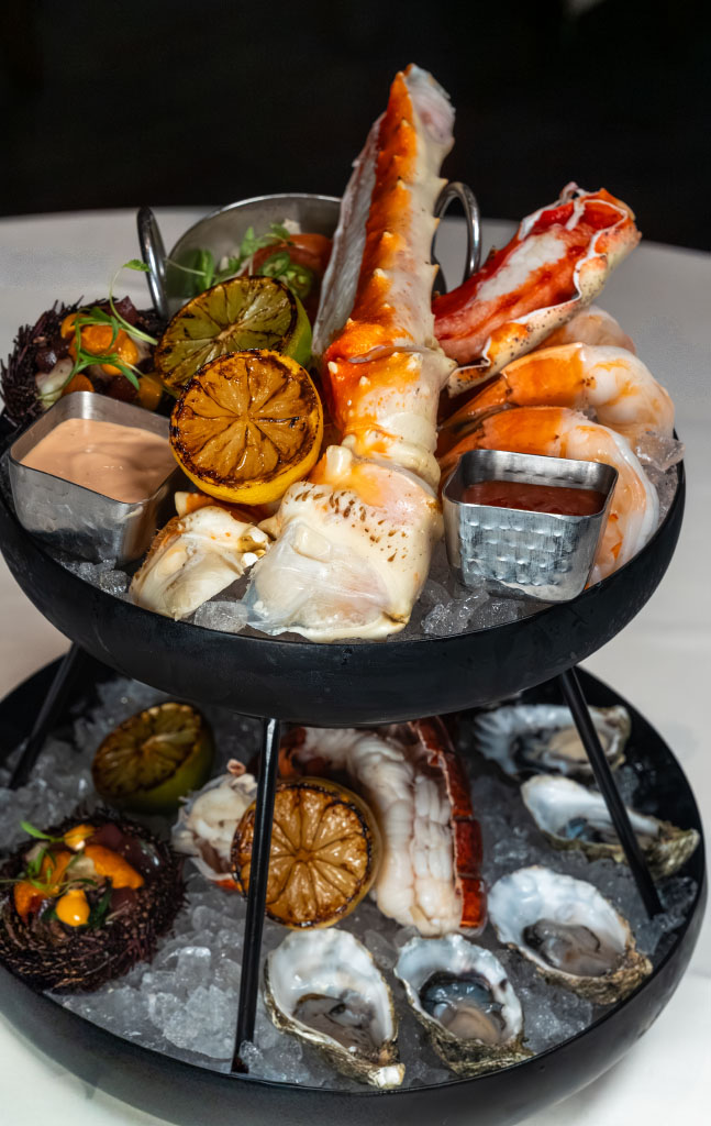 Poached Shrimp, Chilled Oysters, Poached Lobster Tail, King Crab Legs, Ahi & Octopus Poké, Fresh Sea Urchin, Halibut Ceviche, Brioche Toasts, Taro Chips, Wonton Crisps, Trio of Sauces